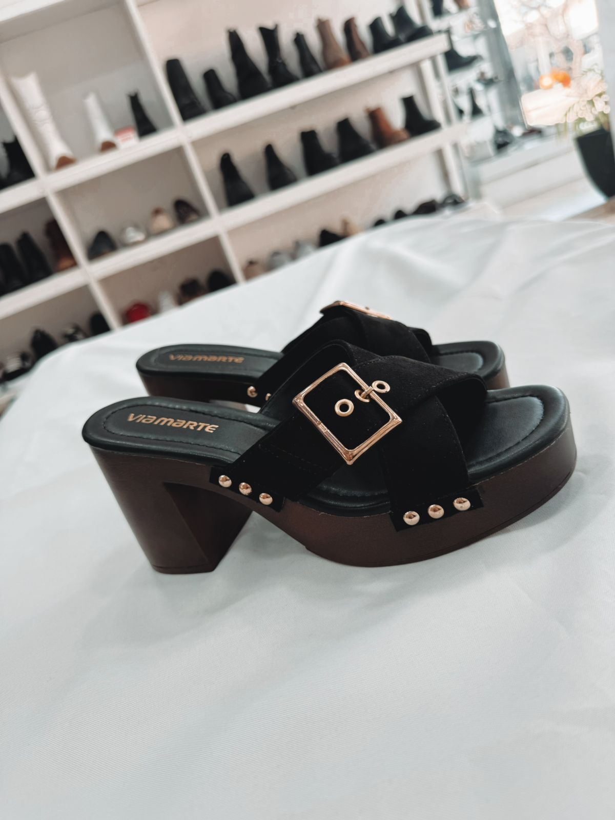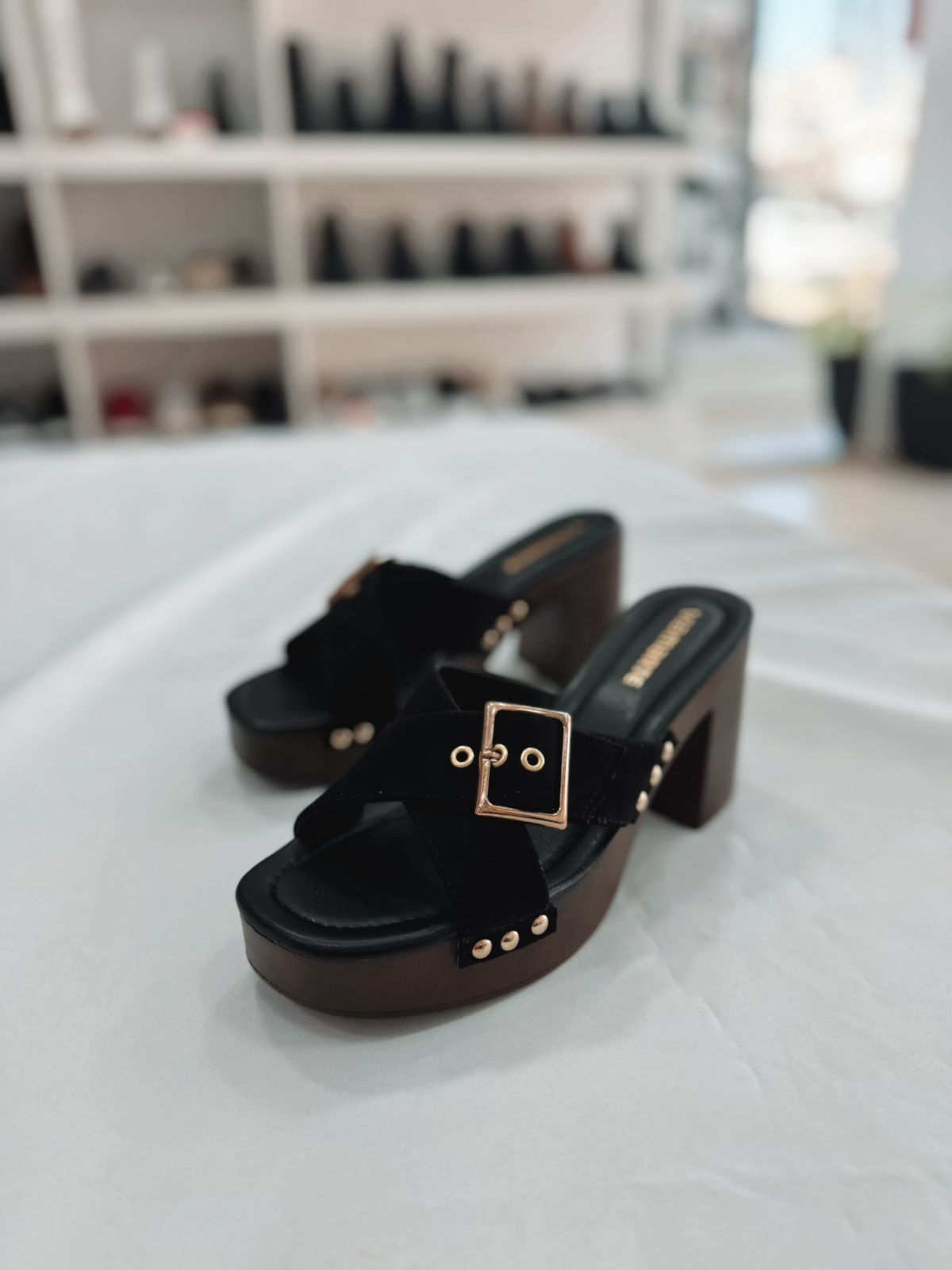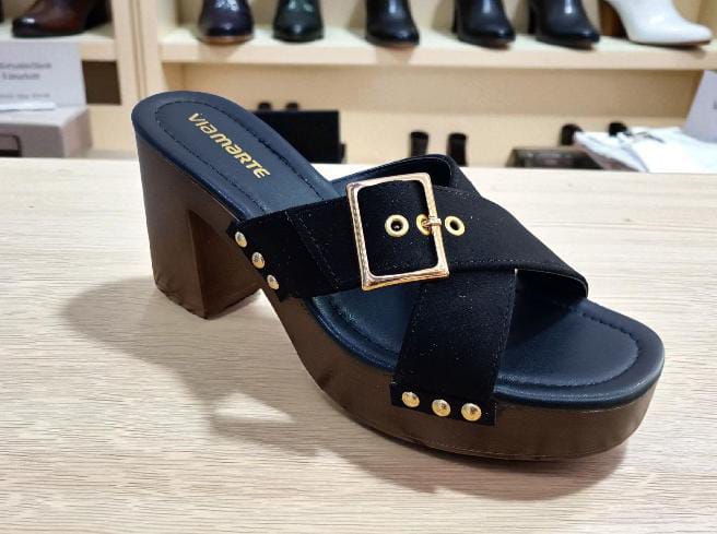 Gamuza sintético negra con detalles en dorado, plantilla acolchada